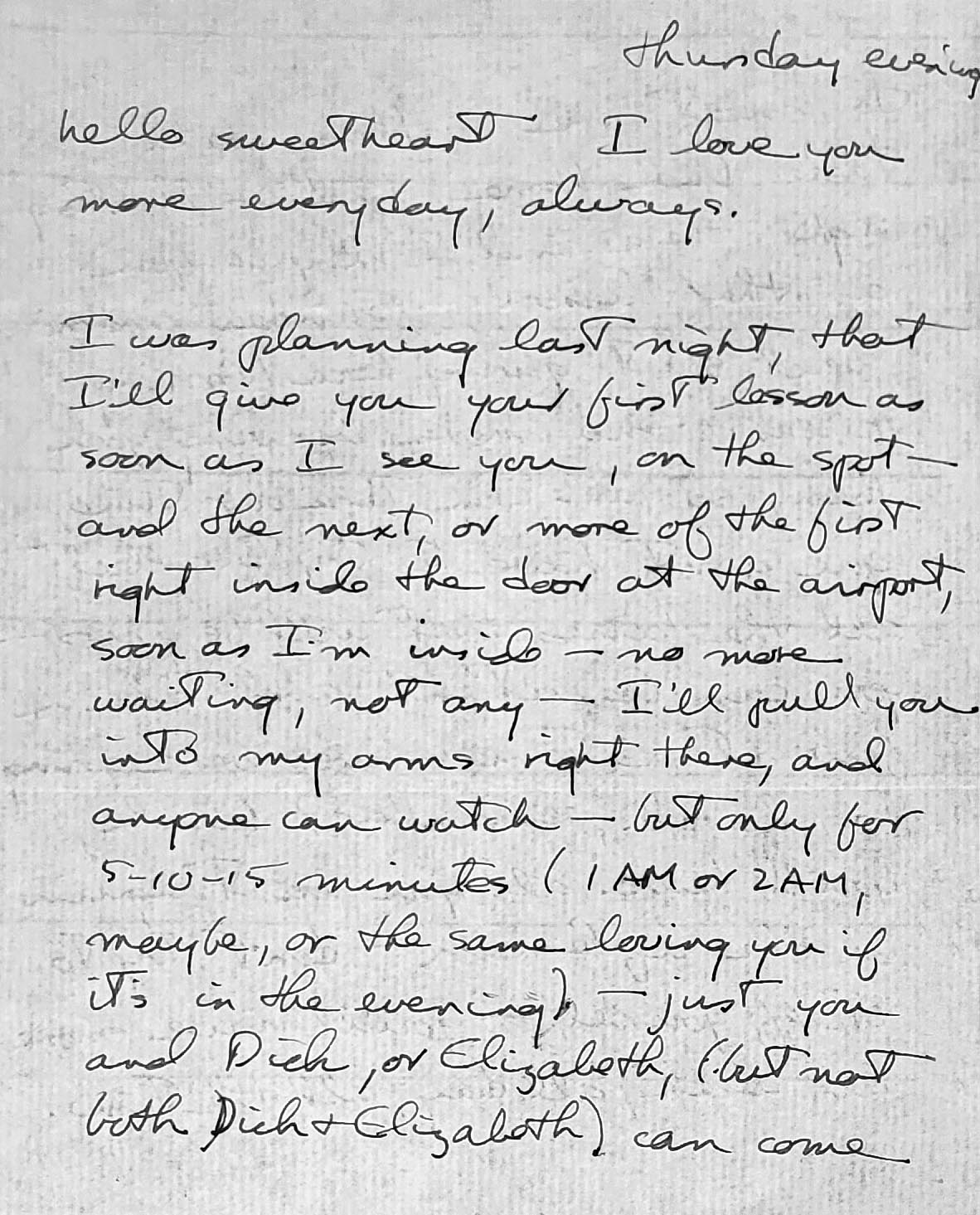 Hello sweetheart! I love you more everyday, always. I was planning last night, that I'll give you your first lesson as soon as I see you, on the spot - and the next, or more of the first night inside the door at the airport, soon as I am inside - no more waiting, not any - I'll pull you into my arms, right there, and anyone can watch, but only for 5-10-15 minutes (1 AM or 2 AM, maybe, or the same loving you if it's in the evening) - just you and Dick, or Elizabeth, (but not both Dick and Elizabeth) can come |