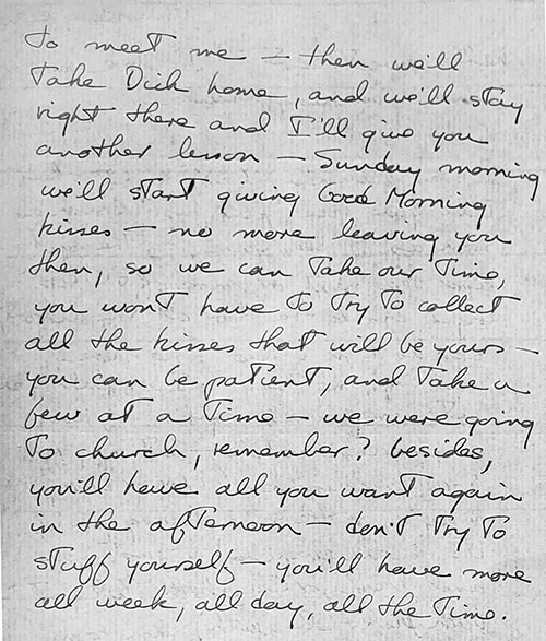 ![]() | to meet me - then we'll take Dick home, and we'll stay right there and I'll give you another lesson - Sunday morning we'll start giving Good Morning kisses - no more leaving you then, so we can take our time, you won't have to try to collect all the kisses that will be yours - you can be patient, and take a few at a time - we're going to church, remember? Besides, you'll have all you want again in the afternoon - don't try to stuff yourself - you'll have more all week, all day, all the time. |