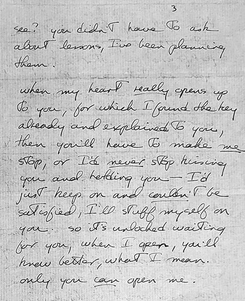 When my heart really opens up to you, for which I found the key already and explained to you, then you'll have to make me stop, or I'd never stop kissing you and holding you - I'd just keep on and couldn't be satisfied, I'll stuff myself on you. So it's unlocked waiting for you, when I open, you'll know better, what I mean. Only you can open me. |