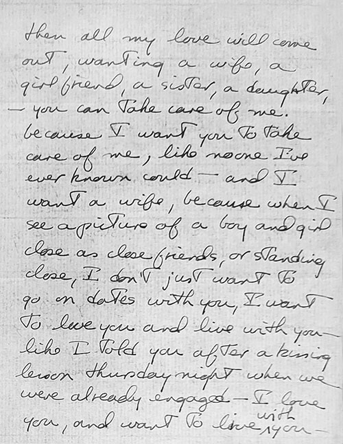 ![]() | then all my love will come out, wanting a wife, a girlfriend, a sister, a daughter - you can take care of me. Because I want you to take care of me, like no one I've ever known could - and I want a wife, because when I see a picture of a boy and girl close as close friends, or standing close, I don't just want to go on dates with you, I want to love you and live with you - like I told you after a kissing lesson Thursday night when we were already engaged - I love you, and want to live with you- |