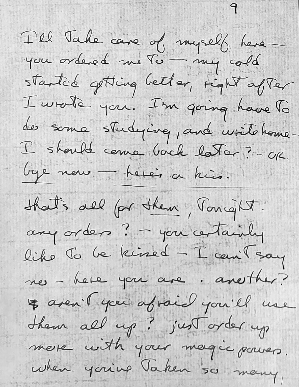 I'll take care of myself here - you ordered me to - my cold started getting better, right after I wrote to you. I'm going to have to do some studying, and write home - I should come back later? OK, bye now - here's a kiss.